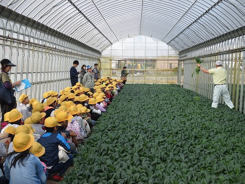 東百舌鳥小学校の3年生(189名)が、堺市中区深井にあるしものファーム小松菜サナタハウスに行き、収穫体験をしました。