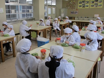 ・出前授業(梅・豆) 実施校:堺市立錦西小学校 実施日:1月27日(木)(3時間目9:40~10:25 6時間目2:40~15:25) 対象:3年(30名) 授業内容:和歌山の農産物を知ろう 梅の栽培方法等の話 食育講和 梅ジュースの作り方 うすいえんどうの話